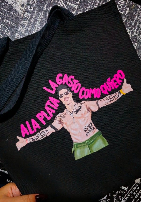 Bolso tote bag gabardina negra premium, medidas 35x40, estampada con dtf textil