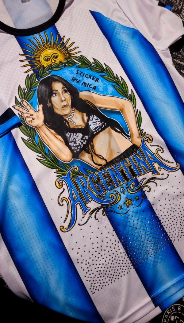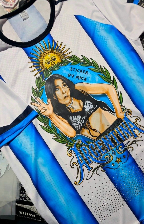 Remera de poliester estampada en DTF textil con strass.